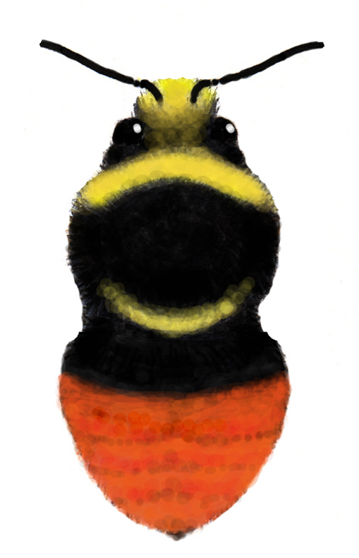 Blaeberry bumblebees are small (typically around the size of a thumbnail) but, being so bright and beautiful, they are hard to miss or mistake! Fiery orange-red hairs cover more than half of their lower body (abdomen), while a soft yellow collar, and a band of yellow behind their wings stand out against a background of black. They are often spotted visiting willow catkins and blaeberry flowers in the spring, or heather, white clover, thistles and ragwort in summer.